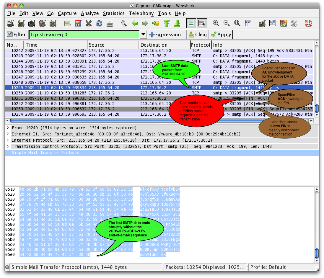 Please see the screenshot attached where I tried to explain the last packets. Unfortunately the capture confirms that it is the remote server that is unexpectedly terminating the connection during the transfer. After one of the DATA packets containing the email contents (and it's not a packet containing the end of the email, as the end-of-email sequence <CR><LF>.<CR><LF> is not there), the remote server 213.165.64.20 suddenly, unexpectedly, sends a FIN packet. FIN packets are requests to close the transmission. I can't be sure if there's a firewall intercepting the packets before they get to SpamFilter or not, but if there is one, it's possible that the FIN packet is actually being generated by the firewall. Unfortunately I'm not able to determine that. ![]() |