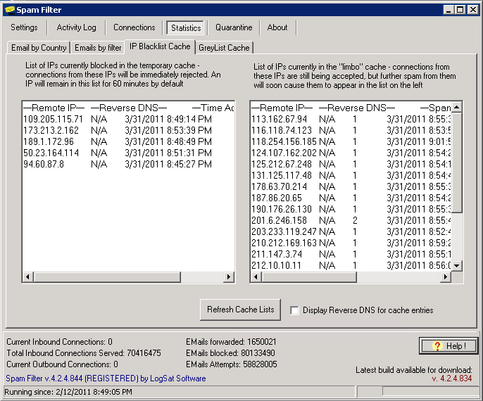 SpamFilter maintains the blacklist cache in memory only - nothing is cached to files. To reset it, you can simply stop/restart SpamFilter. You can also use SpamFilter to see the list of IPs that are currently being blacklisted by following the screenshot below. As an FYI, SpamFilter uses the following parameters to determine when an IP is added to this blacklist cache, and for how long it remains there (by default only one hour): ;If an IP sends more than this number of spams in a certain period of time then it is temporarily banned (blacklisted) IPCacheLimboCountTrigger=3